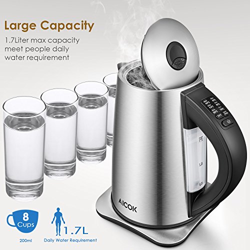 aicok il bollitore a controllo di temperatura rende il riscaldamento dell’acqua più facile; bollitore elettrico facile da usare. Opzioni avanzate che apprezzerai anno dopo anno. + opzioni aggiuntive: • Pulsante di mantenimento del calore per 2 ore – questa opzione del bollitore permette di mantenere l’acqua alla temperatura desiderata fino a 2 ore. • Funzione memoria – Possibilità di rimuovere il bollitore dalla sua base fino a 90 secondi e quando il bollitore torna sulla base, il ciclo di riscaldamento e conservazione del calore viene ripreso da dove era rimasto. • Sistema di messa in ebollizione rapida – Riscaldamento rapido, circa 6 minuti per raggiungere 100 °C al livello massimo. • Indicatore di livello dell’acqua – una finestra molto leggibile mostra esattamente quanta acqua resta nel bollitore. Puoi riscaldare fino a 8 tazze in una volta. • Sicura, affidabile – Il Bollitore Aicok è realizzato pensando allo stile e alla resistenza, con acciaio inossidabile di alta qualità, facile da pulire, sia all’esterno che all’interno. Si spegne automaticamente se messo in moto senza acqua. – Importante: • Tenere lontani bambini dal bollitore quando è in funzione. • Quando non è in uso, staccare il bollitore dalla e riporlo in un luogo chiuso.