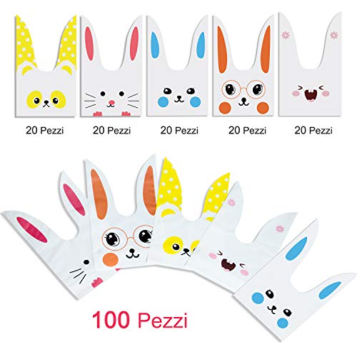 100 pezzi adorabili sacchetti di caramelle a forma di coniglio Materiale: plastica di sicurezza alimentare, inodore, leggera, ecologica e riutilizzabile Usi: Adatto per il confezionamento di dolci, caramelle, biscotti, cioccolata, piccoli regali e persino per preservare perline assortite o altre arti e mestieri. Bomboniere: Adatto per Halloween, Natale, San Valentino, giorno di Pasqua, feste di compleanno, docce nuziali, matrimoni, feste di laurea, ecc. Stile: 5 diversi disegni di coniglietti Dimensioni: 13,5 x 22 cm Il pacchetto include: 100 * sacchetti di caramelle Nota: per ottenere il miglior risultato, si prega di seguire i passaggi (foto sopra) che forniamo per avvolgere le borse.