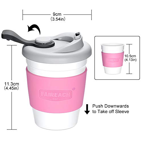 Attenzione:1. Non è una tazza termica, ma il coperchio impedisce al calore di sparire troppo rapidamente. 2. Questa tazza con coperchio non è completamente priva di perdite se la si rovescia, per via del foro per bere disegnato sul coperchio (che facilita lo scorrere del liquido quando si beve). Ma la tazza da viaggio è a prova di fuoriuscite quando si è in movimento.3. Si consiglia vivamente di non riempire eccessivamente la tazza con bevande calde, e si prega di aprire il tappo di chiusura in silicone sul lato superiore prima di coprire il coperchio, altrimenti potrebbe causare una resistenza al vapore.Perché scegliere la tazza da caffè Faireach? 1. Servizio e garanzia: Garanzia incondizionata di 12 mesi senza preoccupazioni. Sostituzione o rimborso totale se non sei soddisfatto al 100% con il nostra tazze mug. 2. Stile di vita ecologico: Le tazze da viaggio riutilizzabili Faireach sono progettate per sostituire le tazze monouso che sono dannose per il nostro ambiente. Forniamo prodotti sostenibili e promuoviamo la cultura del risparmio. Sono i piccoli atti quotidiano che faranno la differenza. 3. Sicurezza: Certificata FDA e realizzata in PLA biodegradabile e silicone alimentare, entrambi privi di BPA, completamente inodori, insapori e inossidabili, ultra sicuri per l’uso quotidiano. 4. Sicuro in lavastoviglie e microonde. 5. La mug da viaggio: La tazza per caffè da asporto perfetta per spostarsi è progettata per il puro piacere del bere in movimento, che ti permette di godere del piacere di un buon caffè ovunque tu vai. Caratteristiche: Capacità: 340 ml / 12 once Intervallo di temperatura: da -20 ℃ a 120 ℃ Materiale: silicone alimentare + PLA biodegradabile (certificato FDA e senza BPA) La confezione include: Mug da caffè * 1