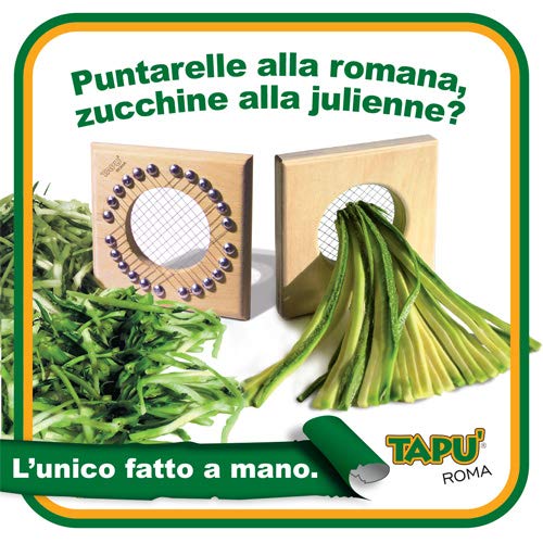 Sui banchi storici dei mercati, in periferia come a Campo de’Fiori, per sfilettare le puntarelle si adottava un “utensile di pulitura” artigianale, da qui l’idea di riprendere, rivalutare e riadattare uno strumento antico a “uso e consumo” di tutti, mantenendone l’artigianalità, ma proiettandolo verso un uso domestico, familiare. TAPU’ è un oggetto intorno al quale si riassapora Roma e si ritrovano le sue atmosfere. Preparare le puntarelle alla romana non è mai stato così facile. Idoneo anche per affettare zucchine alla julienne, oltre a carote, sedano, aglio, ravanelli e würstel. Realizzato in multistrato di betulla, ribattini in alluminio e filo in acciaio inox, materiali non soggetti a deterioramento al contatto con l’acqua che garantiscono qualità e durata nel tempo. Confezionato in bustine termosaldate e contenenti istruzioni con foto, suggerimenti sull’uso e la famosa ricetta delle puntarelle alla romana. Prodotto da TAPU’ ROMA, un’azienda artigiana con sede a Roma. L’unico taglia puntarelle sul mercato intermente realizzato a mano. TAGLIAPUNTARELLE IN ACCIAIO INOX, ALLUMINIO E STRUTTURA IN MULTISTRATO DI BETULLA. MADE IN ROMA